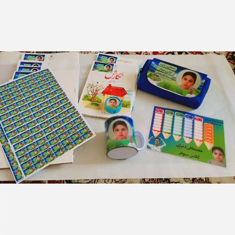 دفتر، جامدادی، لیبل، و حتی لیوان، همه با عکس و نام خودت. دیگه وسایلت هیچوقت گم نمیشن و همیشه توی کلاس خاصترین خواهی بود."